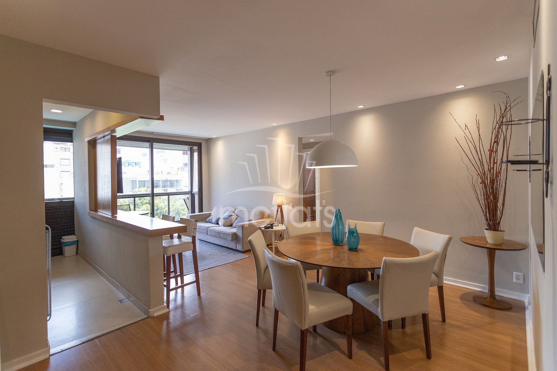Apartamento de 100 m², Suite, habitación, bamheiro social, comedor, cocina y balcón, detectores de humo, aire acondicionado central, refrigerador, microondas, caja fuerte individual, Internet wifi y aparcamiento gratuito.