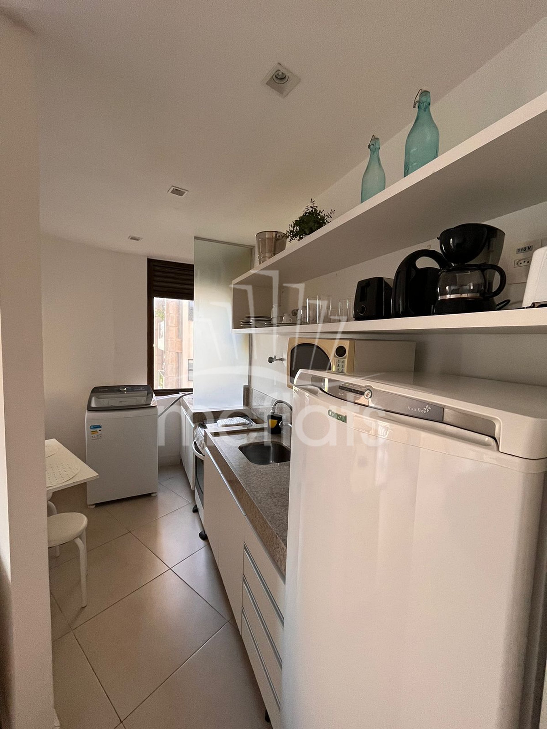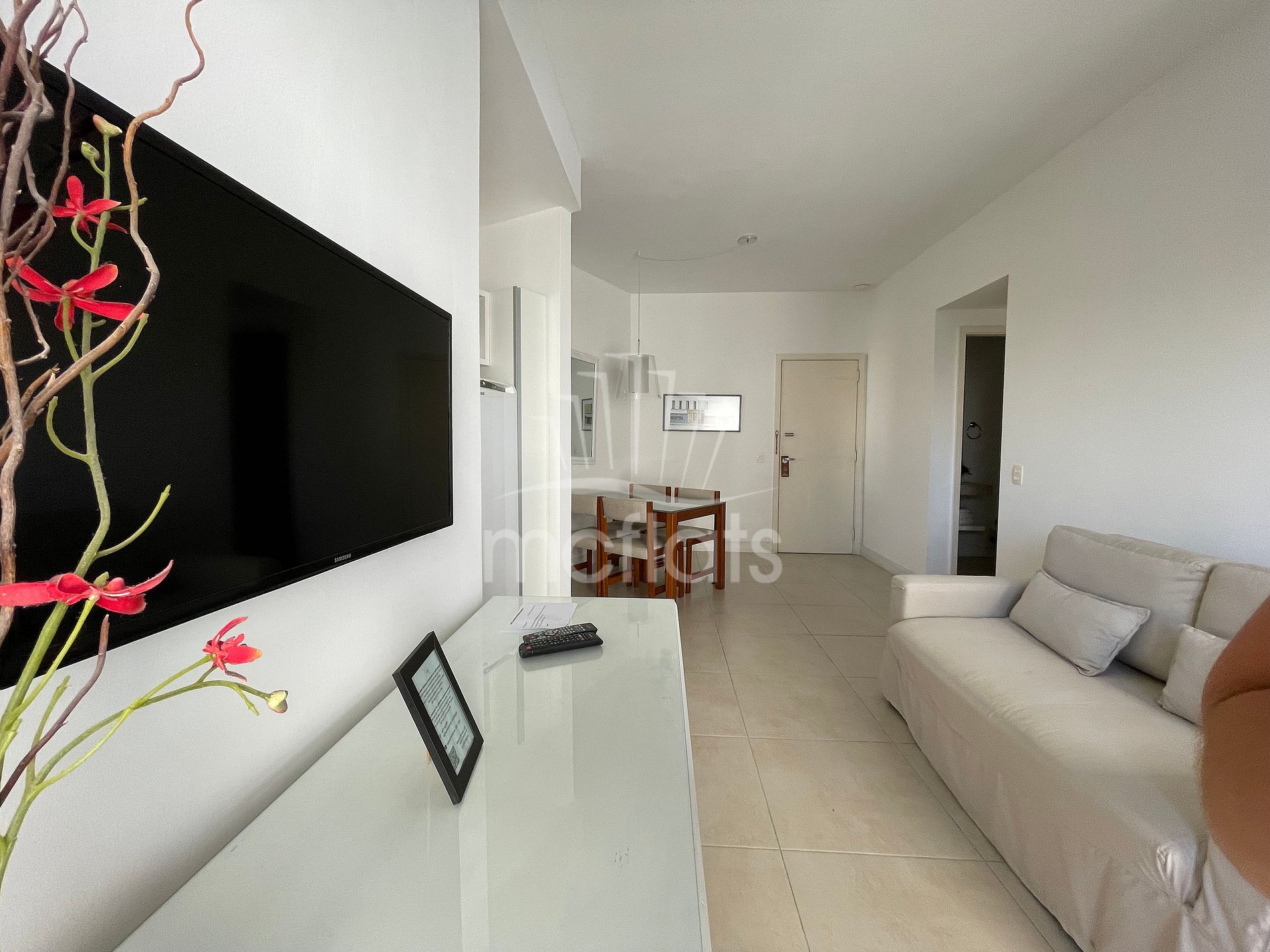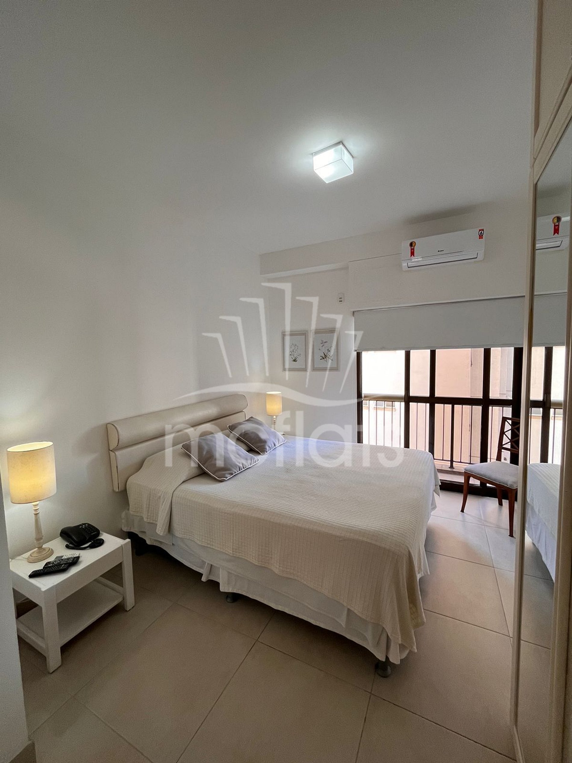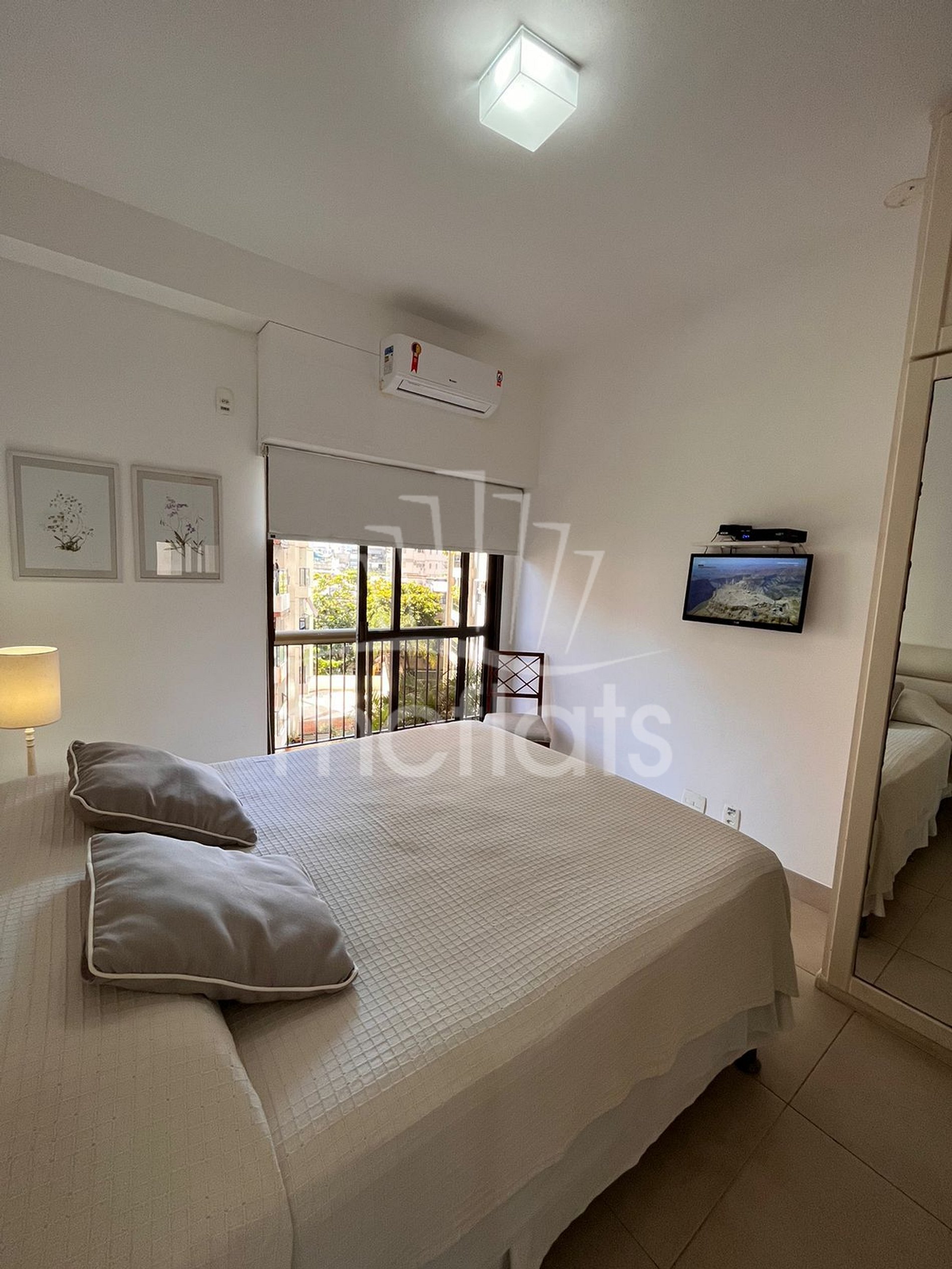 Apartamento de 48m² com varanda, quarto, sala, banheiro e cozinha, Tv por assinatura, Internet, cofre individual, microondas, geladeira, fogão e ar condicionado. Mobiliado e equipado com utensílios de cozinha.