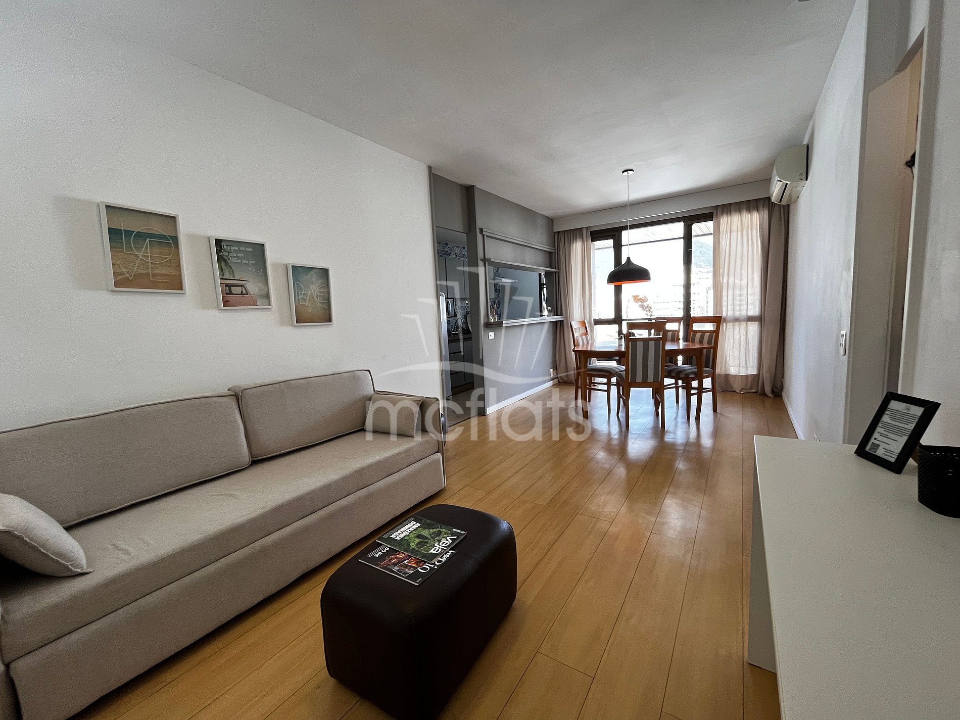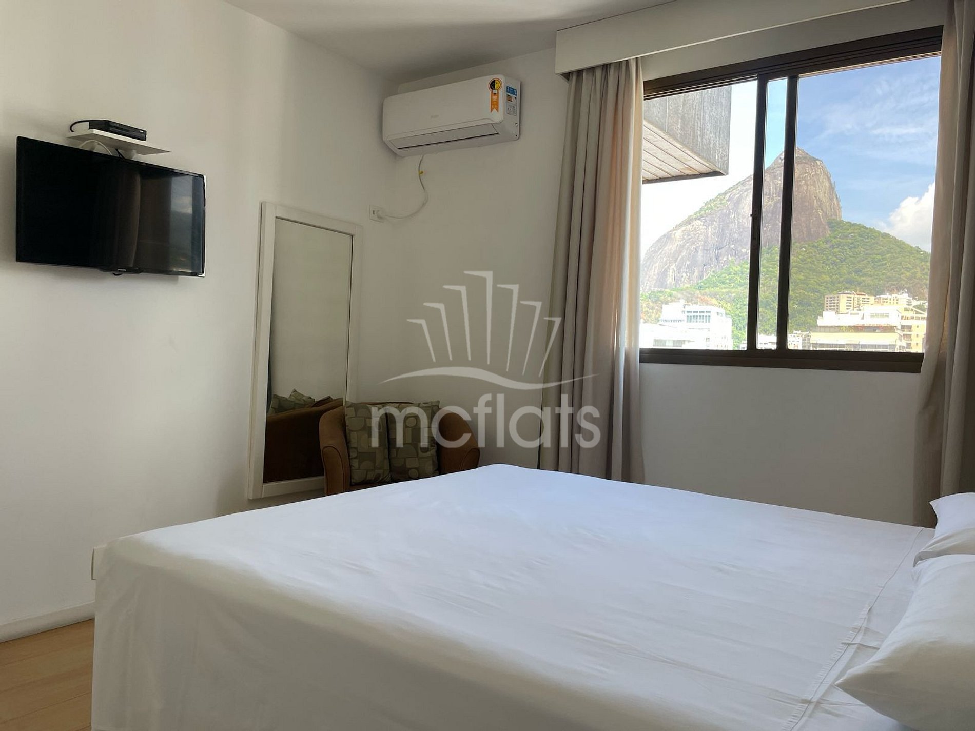 O apartamento, totalmente equipado e mobiliado, dispõe de um quarto, banheiro, varanda na sala e no quarto com vista lateral, sala de estar e jantar e cozinha com microondas, geladeira, fogão, eletrodomésticos e utensílios de cozinha, ar condicionado na sala e no quarto, TV por assinatura, Wi-Fi gratuito e cofre individual.