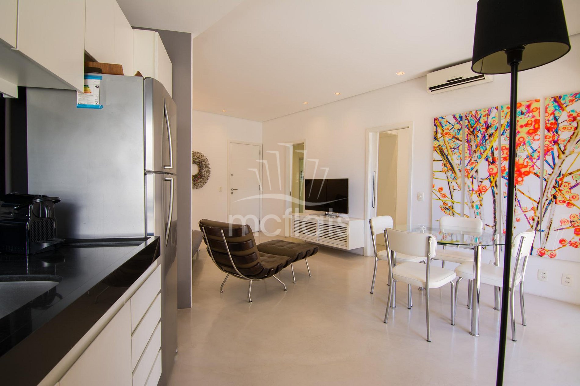 Apartamento de 55m² com varanda, quarto, sala, banheiro e cozinha, Tv por assinatura, Internet, cofre individual, microondas, geladeira, fogão e ar condicionado. Mobiliado e equipado com utensílios de cozinha.