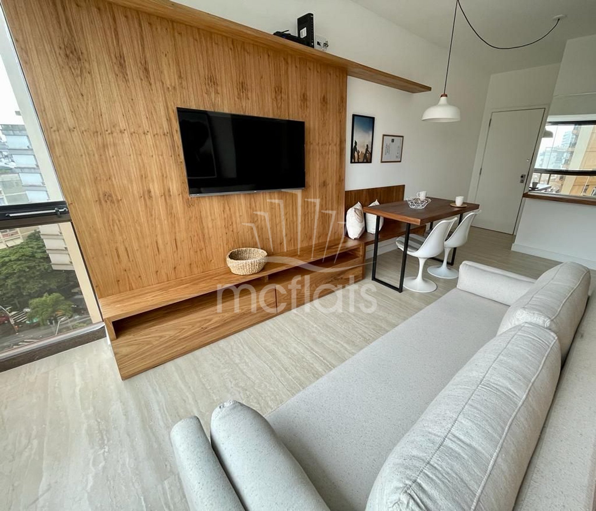 Lindo apartamento recém reformado, totalmente mobiliado, dispõe de quarto com cama tamanho queen, TV a cabo, ar condicionado split, guarda roupas no estilo closet, bancada para trabalho; sala de estar e jantar com sofá cama, ar condicionado split, TV a cabo, internet Wi-Fi, mesa de jantar; cozinha totalmente equipada com microondas, geladeira, cooktop, forno elétrico, máquina lava e seca, eletrodomésticos e utensílios de cozinha, banheiro com box blindex.